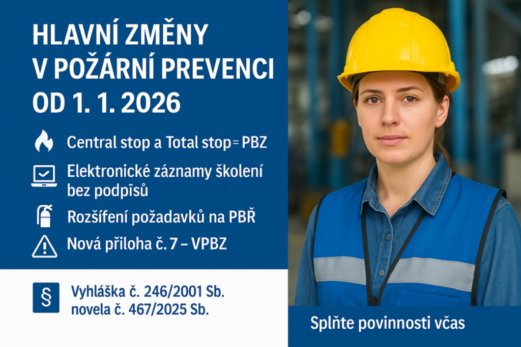 Od 1.1.2026 nabývá účinnosti nové znění vyhlášky č. 246/2001 Sb., o požární prevenci. Novelizujícín předpisem je vyhláška č. 467/2025 Sb.